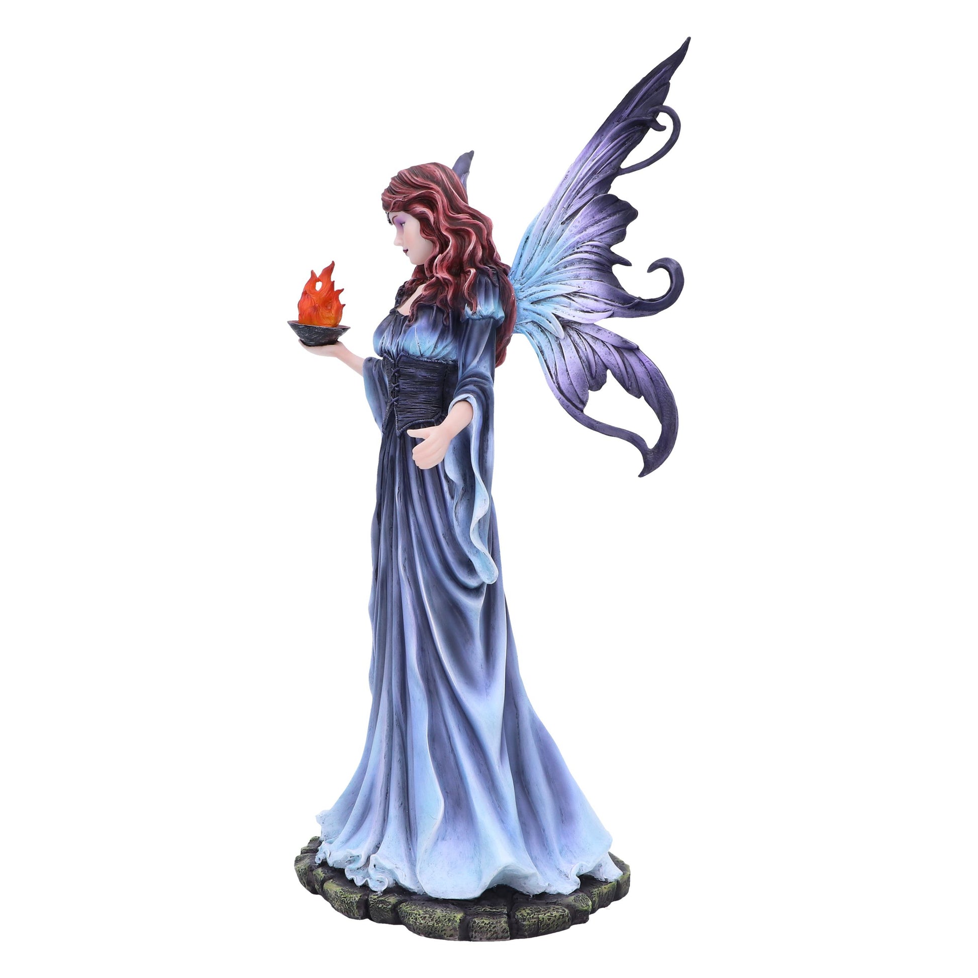 Enchant your world with this Enya Fairy Figurine. Cloaked in rich shades of purple and blue, she holds a cup of flickering fire, casting an entrancing glow. The intricate details and captivating design evoke an aura of magic and mystery. Cast in the finest resin before being expertly hand-painted, this breathtaking figurine is the perfect piece for fantasy and fairy lovers alike!