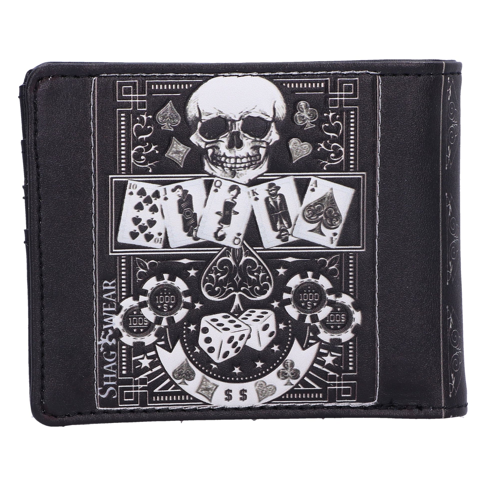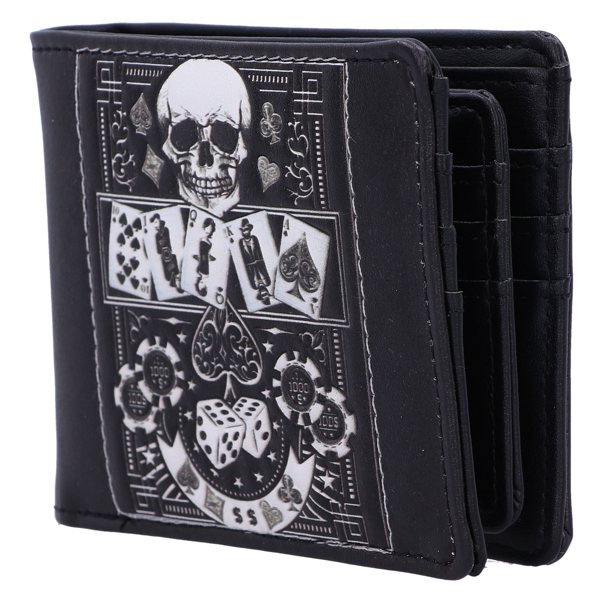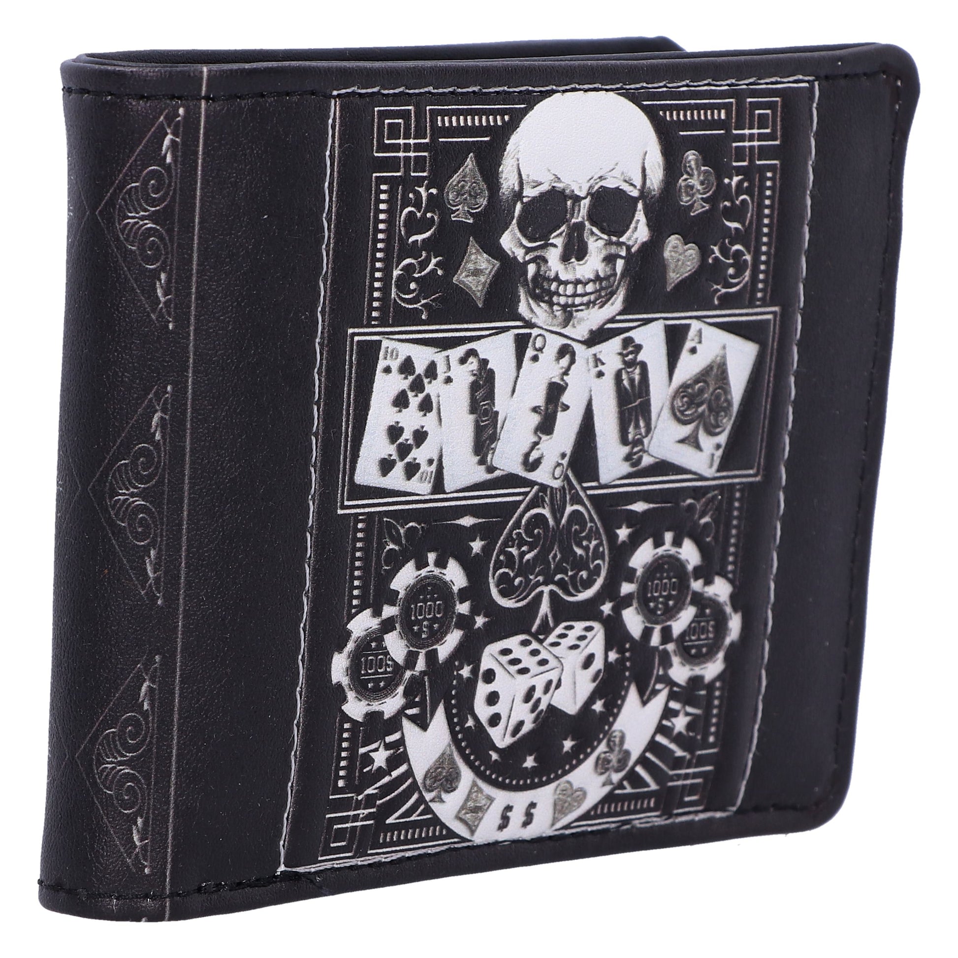 Unleash your daring style with the gothic 'Feeling Lucky?' Wallet. A fusion of edgy and playful elements, this wallet features a bold skull design surrounded by the allure of a poker table, complete with cards and dice. Crafted for both fashion and function, this statement piece adds an element of intrigue to your everyday carry and is the perfect addition to any gothic collection.