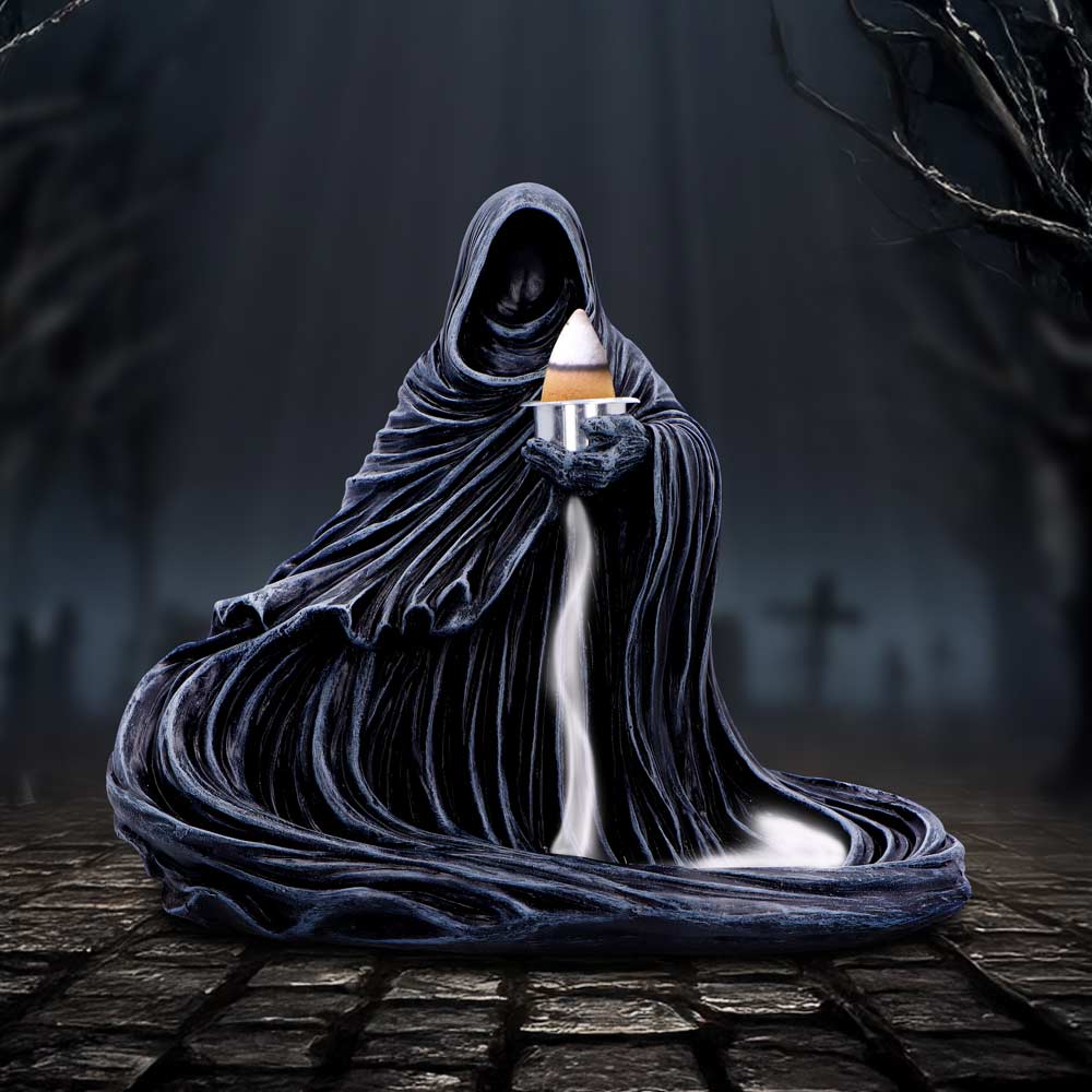 The Last Scent Backflow Burner from Nemesis Now is a hauntingly beautiful piece that captures the eerie presence of Death, cloaked in swirling robes and holding an incense cone. Standing at 15cm tall, its crafted from durable resin and hand-painted to highlight every ghostly detail. Designed for use with backflow incense, it creates a captivating smoke effect that flows around the figure for a dramatic display. Packaged in a branded box, with protective inner packing, it's ideal for gifting and collecting. Perfect for fans of gothic decor, fantasy art, or spiritual ambience, let your space come alive with dark elegance.